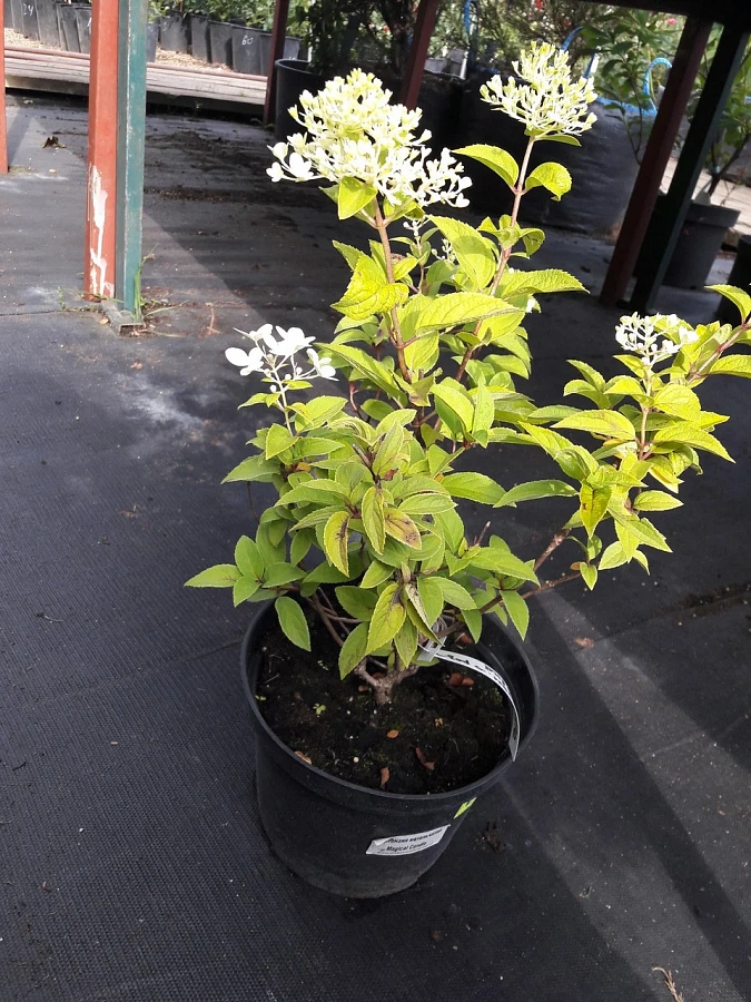 Саженцы гортензии метельчатой Мэджикэл Кэндл (Magical Candle) являются одним из лучших сортов этого вида растения. Крупномеры отличаются красивым цветением в виде кружевных метелок бело-кремового цвета с оттенком свежего лайма, переходящим к осени в красноватый цвет. Цвести начинают с середины лета и до середины осени. Особенности сорта: