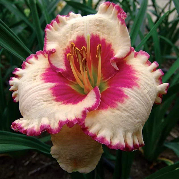 • Окраска цветка : кремово-жёлтый с красной окантовкой и глазком, горло зелёное
