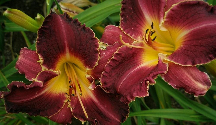 Рассада лилейника Туз (Tooth) прекрасно дополнит более светлые сорта этого растения в многолетней клумбе. Также может выращиваться для срезки в букетные композиции, а для быстрого размножения часто используют его семена. Цветки у этого сорта крупные, до 17 см в диаметре. Корни достаточно неплохо переносят морозные зимы, а листва долгое время сохраняет свой сочный зеленый окрас. Бутоны лилейника Туз темно-вишневые с ярким желтым горлышком, из которого исходят радиальные лучи того оттенка. Верхние лепестки с аккуратной гофрировкой по всему краю придают цветку особое изящество.