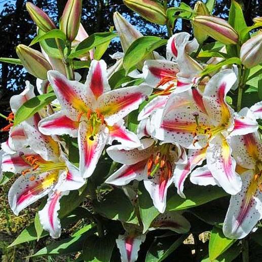 Луковицы лилии восточной Плейтайм (Lilium oriental Playtime) подходят для выращивания на хорошо освещенных местах с питательной почвой. Многолетники неприхотливы, с ними легко справятся даже начинающие садоводы. Высота стебля около 90-110 см. С начала июля до августа на нем красуются крупные цветы диаметром до 15-20 см. На одном стебле одновременно может формироваться до 8 таких соцветий. Окраска лилий восточных Плейтайм белоснежная с желто-зеленой полоской по центру и ярко-розовыми мазками. На протяжении всего цветения от бутонов исходит приятный аромат.