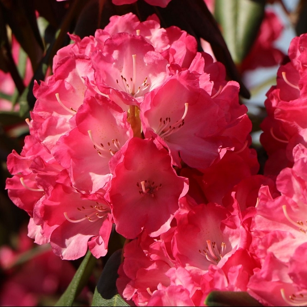 Саженцы рододендрона Фантастика (Fantastica) вырастают в эффектные кустарники, цветение которых украсит любые виды газонов и клумб. Растение имеет яркие темно – розового цвета снаружи и светлее внутри цветочки в конической формы соцветиях, которые радуют долгим пышным цветением в мае – июне. У растения кожистые вечнозеленые крупные листья. В рост саженец рододендрона Фантастика идет медленно.