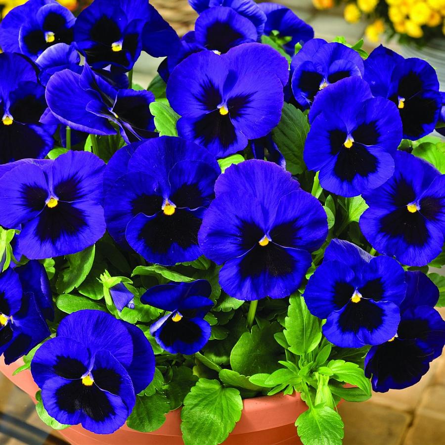 Виола крупноцветковая "Маммот Блу-Ти-Фул" - это настоящее чудо природы, которое поразит вас своей красотой и изяществом. Это растение отличается высокими декоративными качествами и неповторимым черно-синим оттенком цветков, размер которых достигает 7-9 см. Высота растения составляет 15-20 см, что делает его идеальным выбором для групповых посадок в солнечных и полутенистых местах.